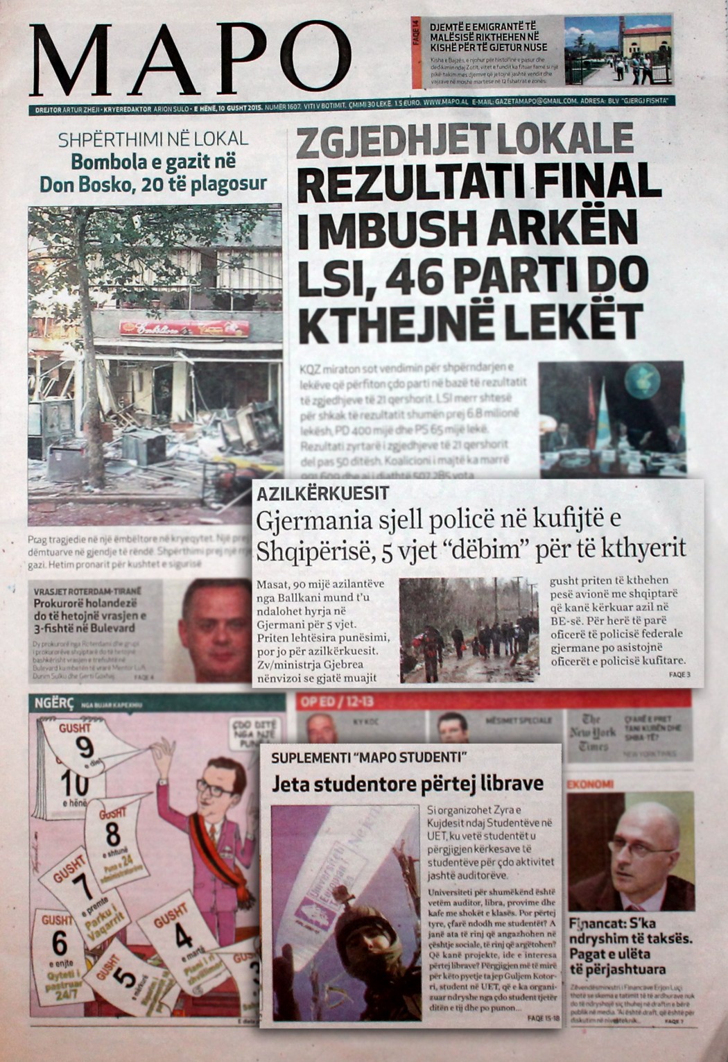 Faqja e pare e gazetes Mapo, 8 Qershor 2015