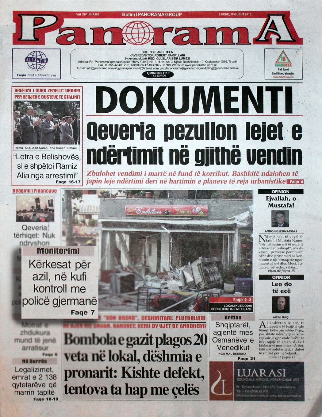 Faqja e pare e gazetes Panorama, 8 Qershor 2015