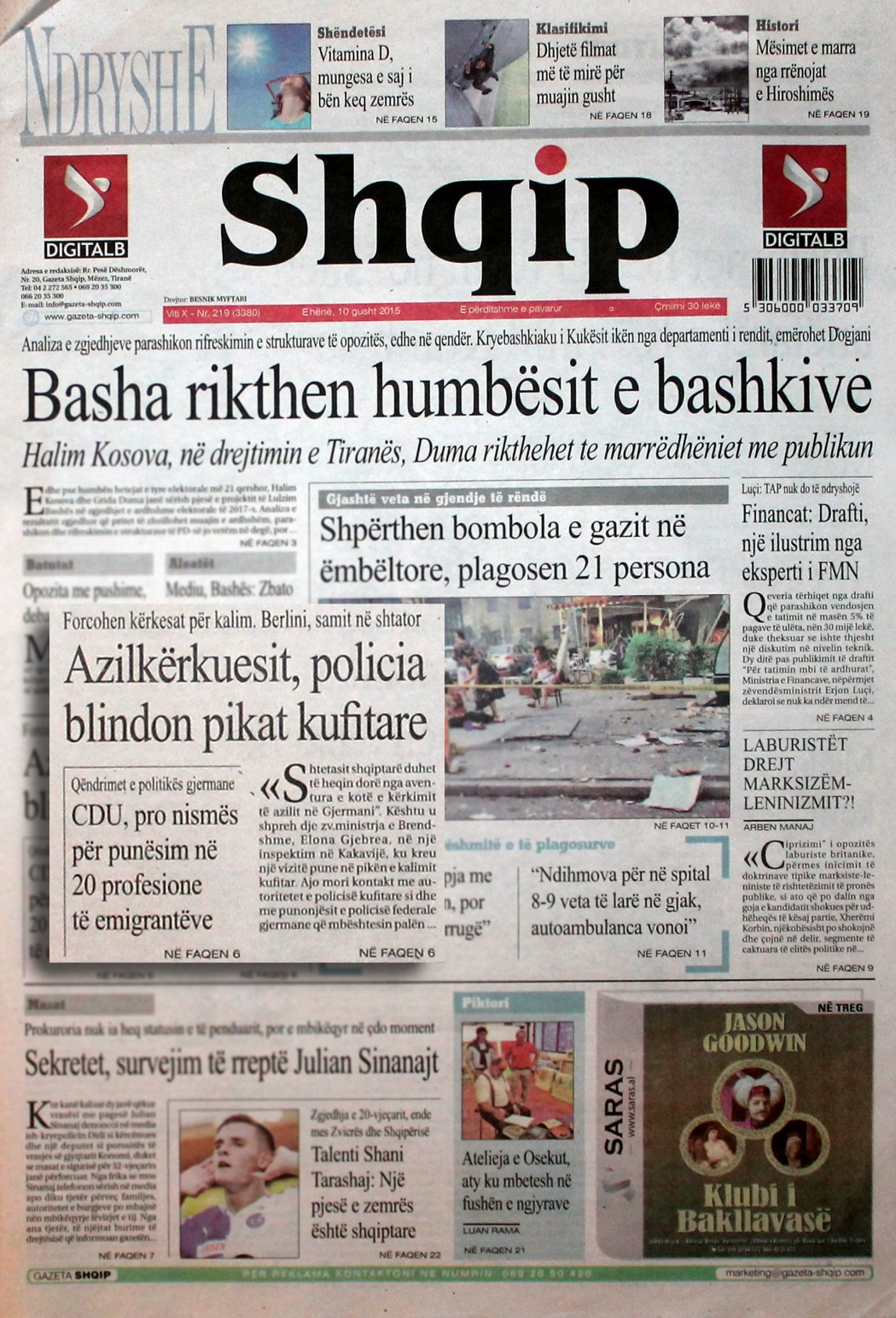 Faqja e pare e Gazetes Shqip, 8 Qershor 2015